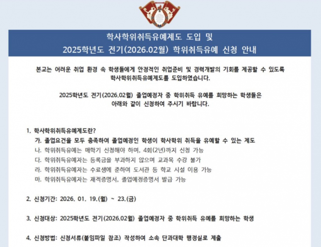 대학의소리방송국 재학생 신분 유지해 취준한다… ‘학사학위취득유예제도’ 도입이하윤 기자 2026-01-20 hit 51우리 대학이 취업 준비를 이유로 졸업을 미루고 싶어하는 학생들을 위해, 올해 2월 졸업 예정자를 대상으로 학…