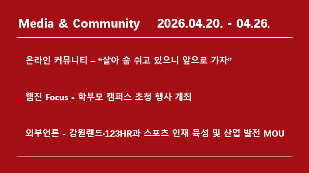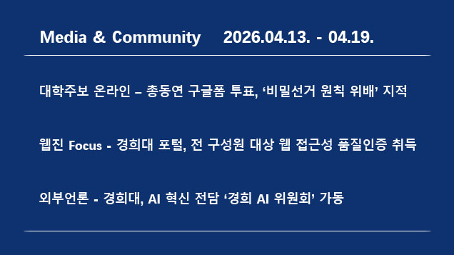 미디어센터 “살아 숨 쉬고 있으니 앞으로 가자”이후승 기자 2026-04-27 hit 30지난 4월 20일부터 26일까지 우리학교 관련 한 주간의 미디어·여론 동향을 살펴본다.