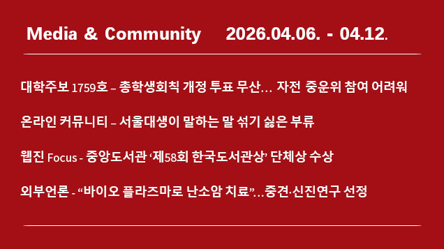 미디어센터 서울대생이 말하는 말 섞기 싫은 부류이후승 기자 2026-04-13 hit 129지난 4월 6일부터 12일까지 우리학교 관련 한 주간의 미디어·여론 동향을 살펴본다.