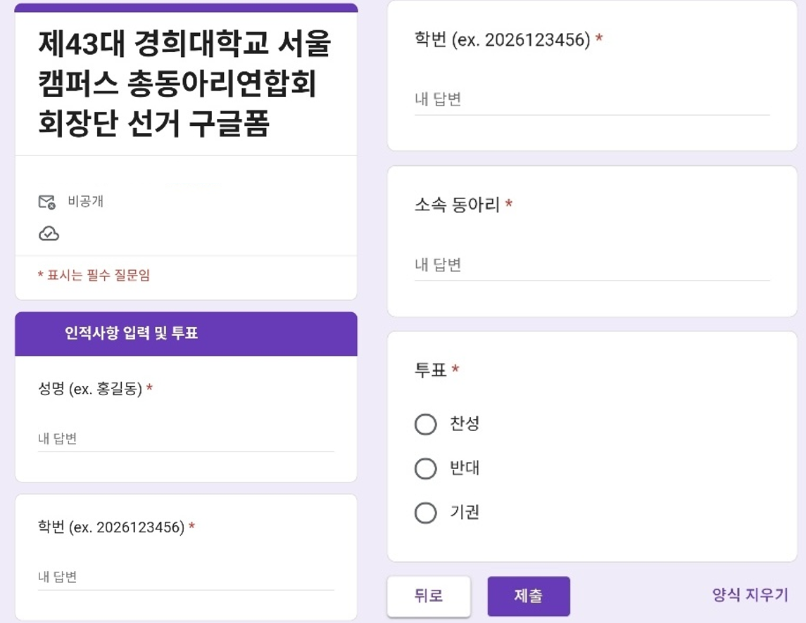 대학주보 총동연 회장단 선거 구글폼 투표… ‘비밀선거 원칙 위배’ 지적김예찬 기자 2026-04-17 hit 401이번 구글폼 투표는 응답과 개인정보가 함께 수집되는 구조로 운영돼 비밀선거 원칙 위배 가능성이 제기됐다.