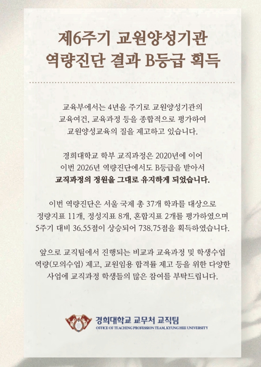 대학주보 교원양성기관 역량진단 B등급 전공교육 전임교원 확보는 숙제김가빈 기자 2026-04-11 hit 32우리학교 학부 교직과정과 교육대학원이 교육부와 한국교육개발원이 실시한 ‘6주기(2022~2025) 교원양성기…