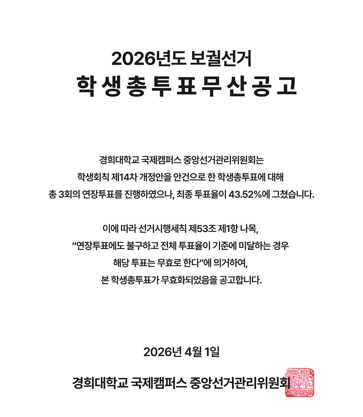영자신문[2026 Global By-election] Route Elected as The 58th GSA with 51.04% Turnout