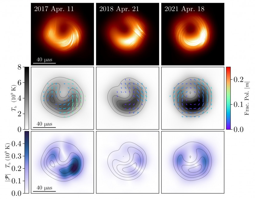 However, earlier EHT studies did not address how M87*’s magnetic field evolves over time. Additionally, limited resolution prevented the team from confirming the existence of M87*’s relativistic jet. To fill these gaps, this year’s EHT study analyzed the polarization of light emitted by the matter surrounding M87*, drawing on polarimetric data collected in 2017, 2018, and 2021. This makes September’s paper the first multi-epoch analysis on M87*’s magnetic field shifts.