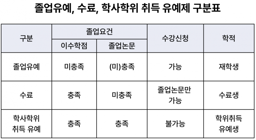 기존 우리학교 졸업 유예 제도는 ‘수료’와 ‘졸업유예’ 두 가지 학적 상태로만 구분됐다. 학사운영규정에 따르면 졸업 기준 학점을 모두 이수했으나 졸업논문을 작성하지 못한 경우 ‘수료’로, 졸업 기준 학점과 논문 요건을 모두 충족하지 못한 경우 ‘졸업유예’로 판정된다. 두 제도 모두 졸업 요건을 일부 충족하지 못한 상황에서 사용할 수 있다. 서울대, 연세대, 고려대 등 서울권 주요 대학의 경우 일정 기간 졸업요건을 충족한 이후에도 학생이 자율적으로 졸업 유예를 선택할 수 있는 반면, 우리학교 학생들은 학적 상태를 자의적으로 선택할 수 없었다.