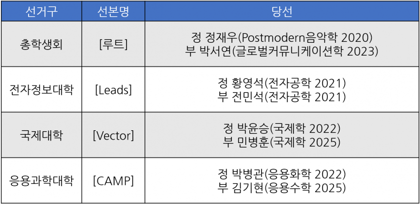 ▲ 2026학년도 총학생회 단위 보궐선거 연장투표에서 루트 선거운동본부(선본)의 정재우(Postmodern음악학 2020) 정후보와 박서연(글로벌커뮤니케이션학 2023) 부후보 당선이 확정됐다.